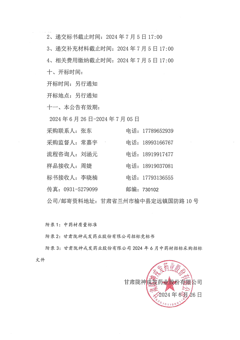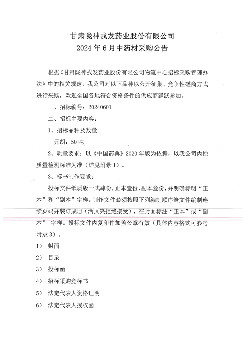 甘肃陇神戎发药业股份有限公司2024年6月中药材采购公告