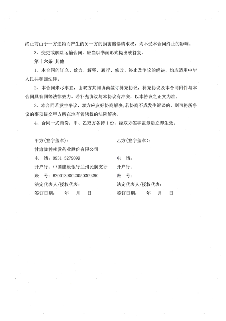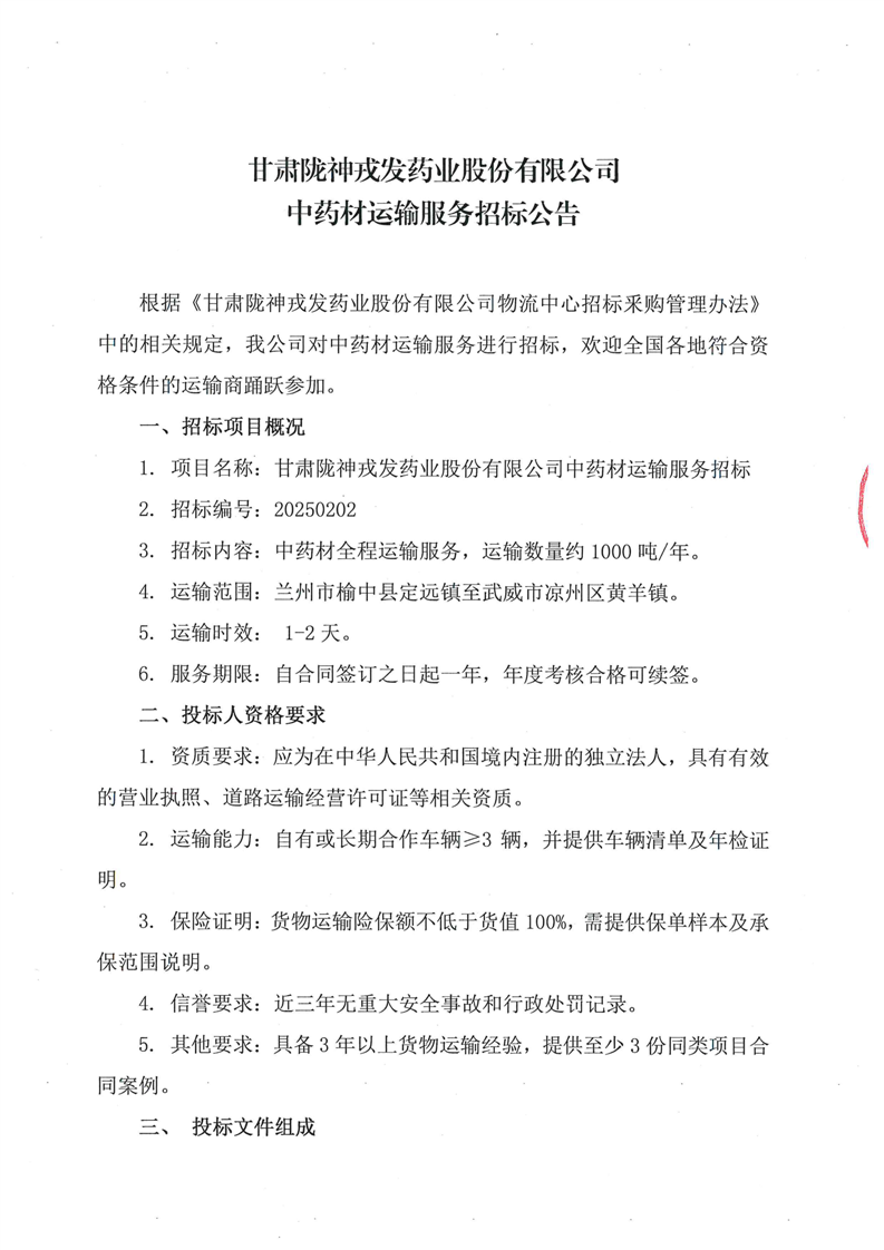 甘肃陇神戎发药业股份有限公司中药材运输服务招标公告