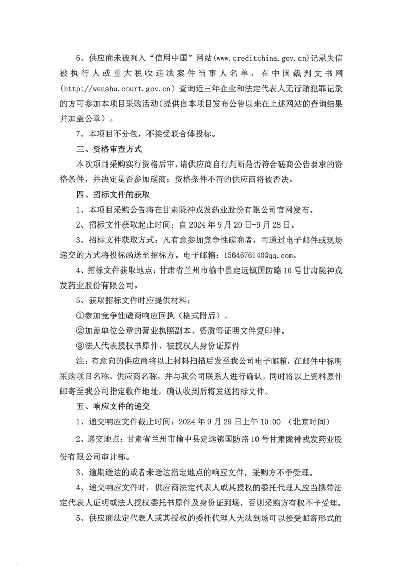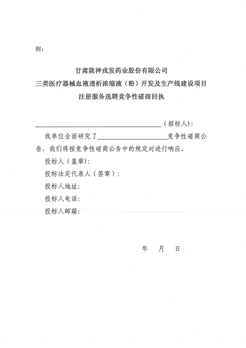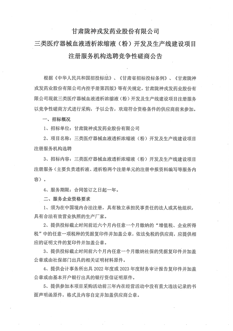 甘肃陇神戎发药业股份有限公司三类医疗器械血液透析浓缩液(粉)开发及生产线建设项目注册服务机构选聘竞争性磋商公告