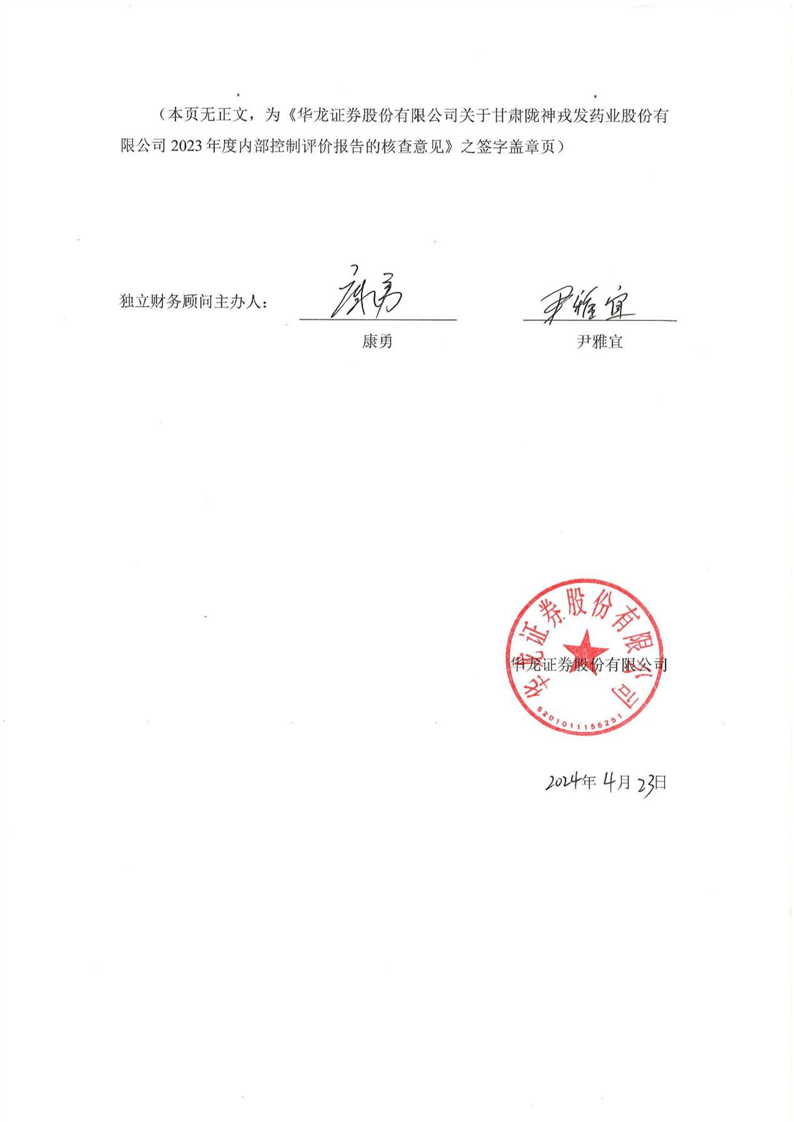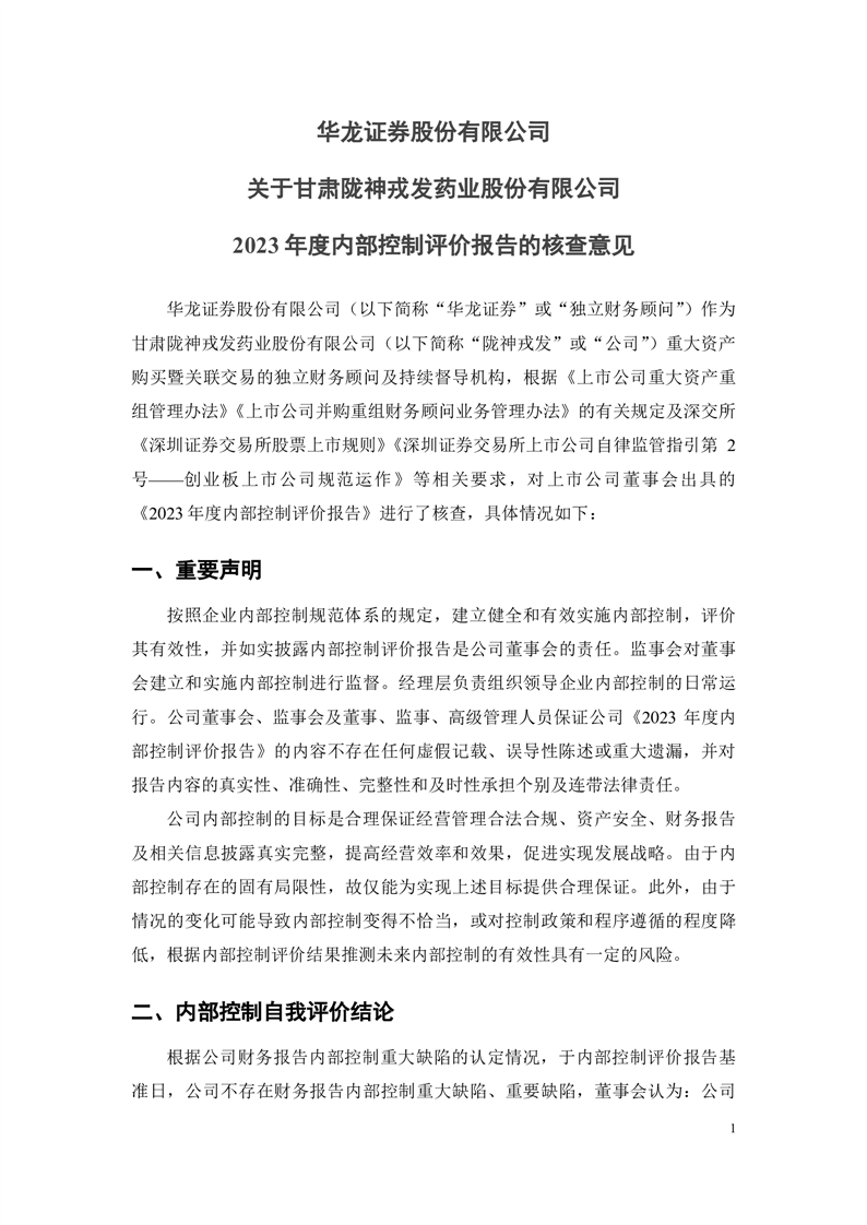 华龙证券股份有限公司关于甘肃陇神戎发药业股份有限公司2023年度内部控制评价报告的核查意见