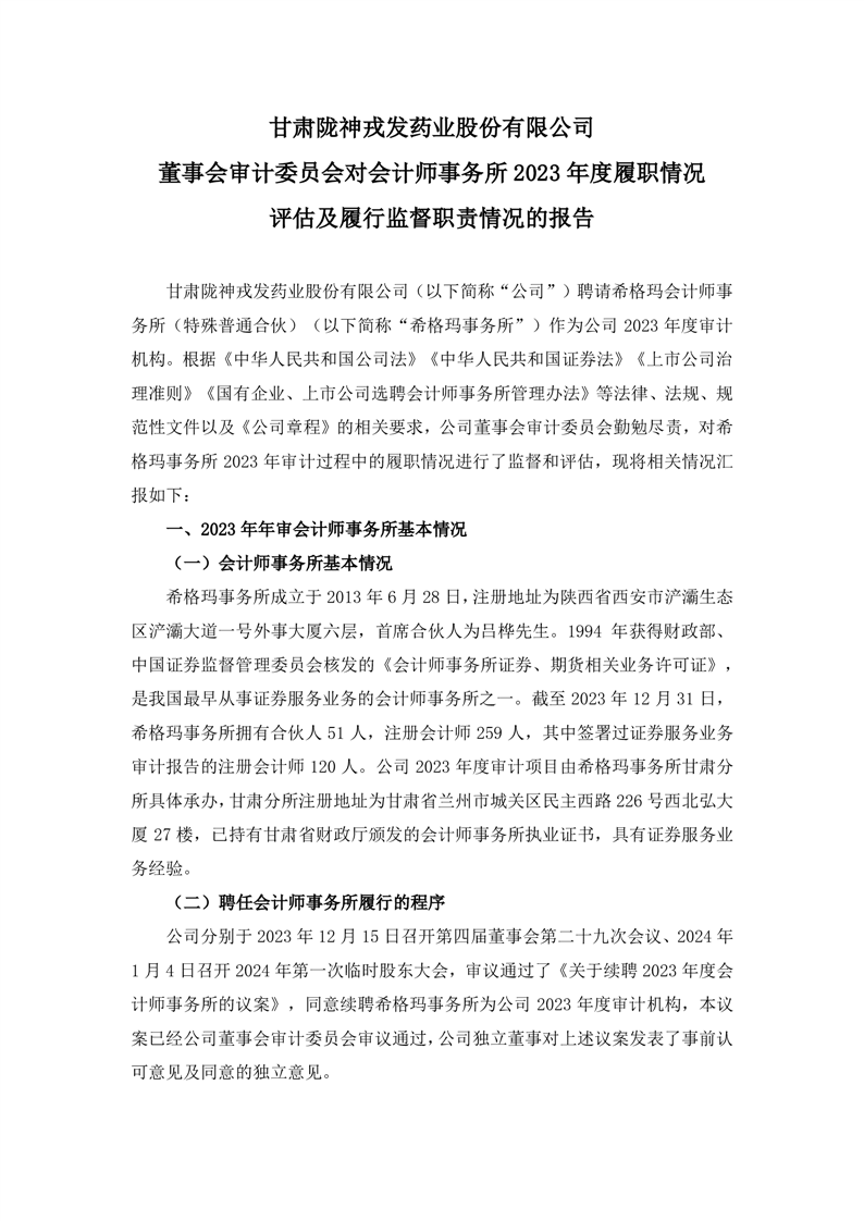 董事会审计委员会对会计师事务所2023年度履职情况评估及履行监督职责情况的报告