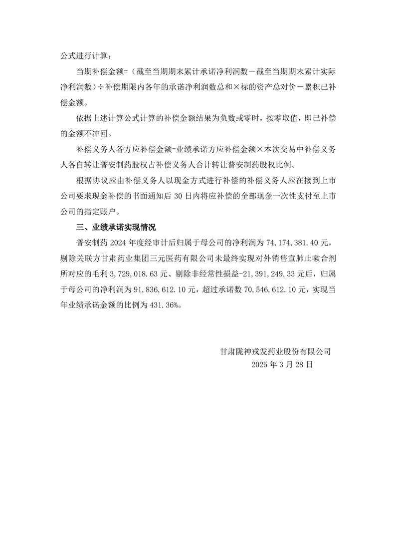 甘肃普安制药股份有限公司2024年度业绩承诺完成情况的专项说明