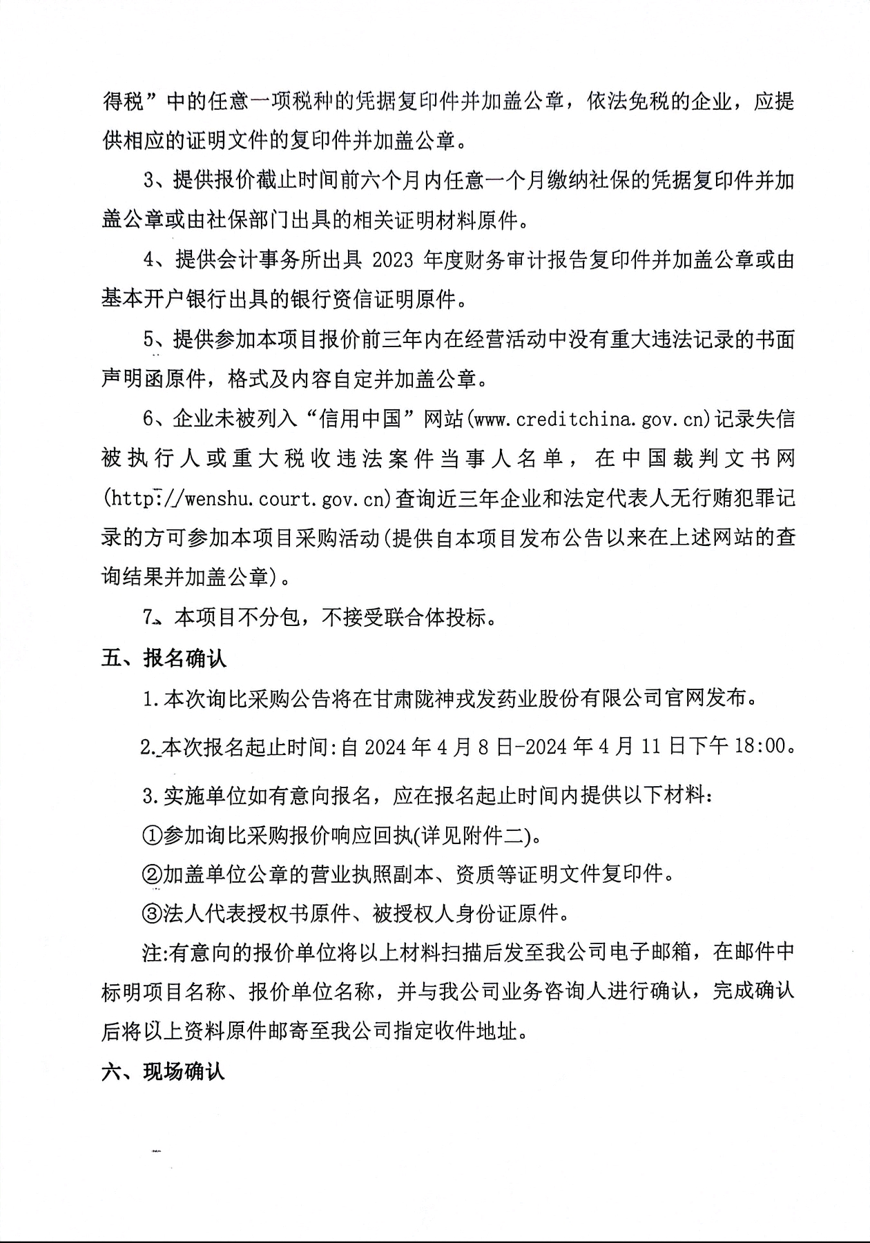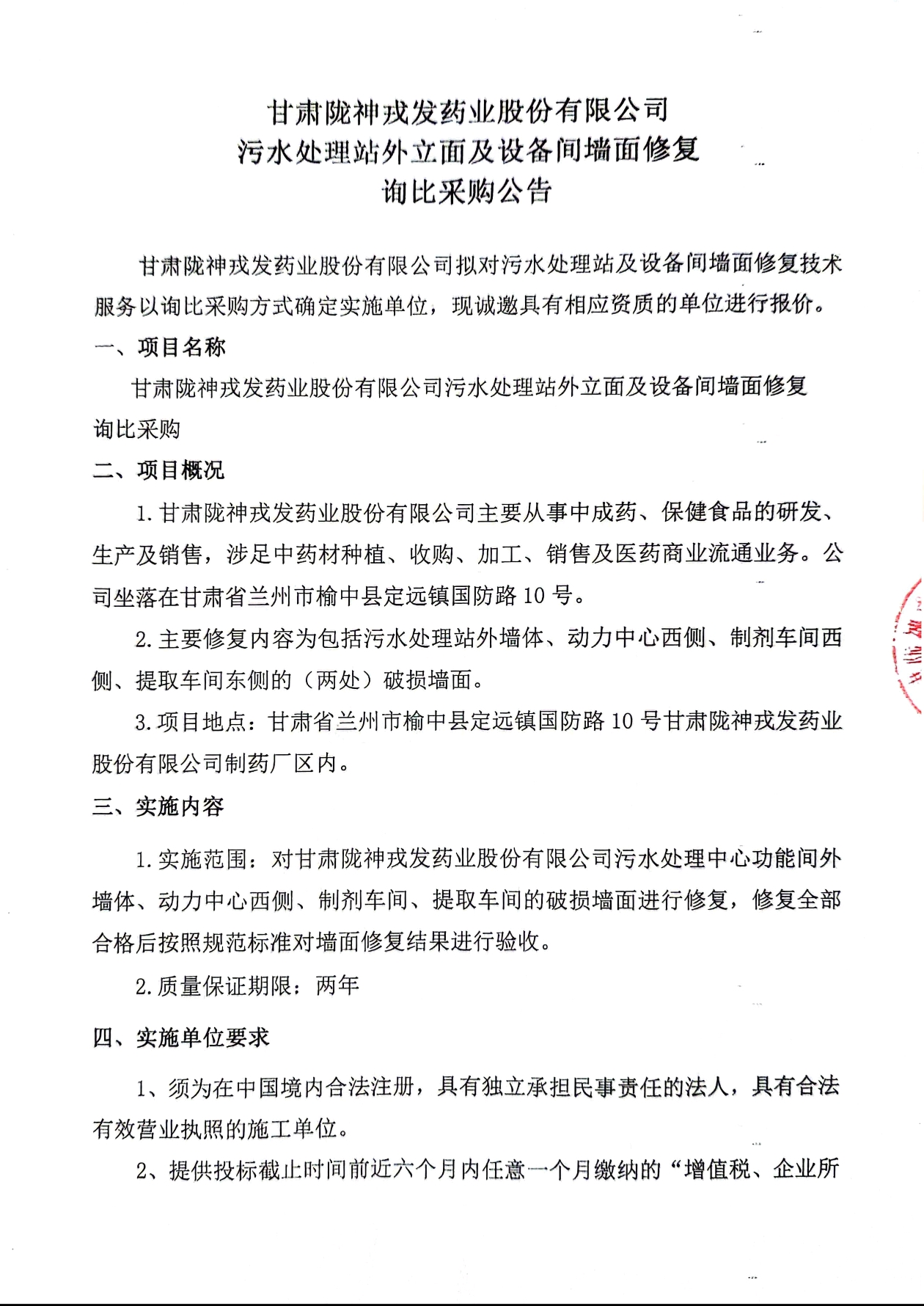 甘肃陇神戎发药业股份有限公司污水处理站外立面及设备间墙面修复询比采购公告