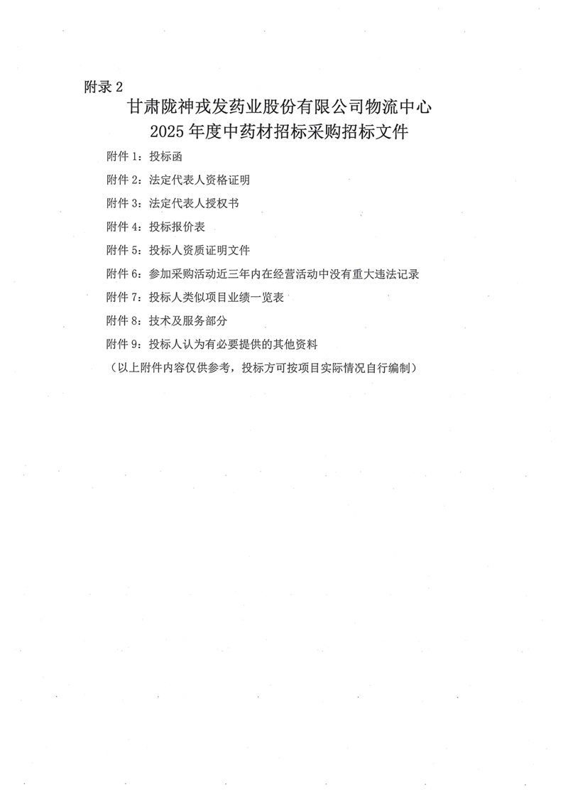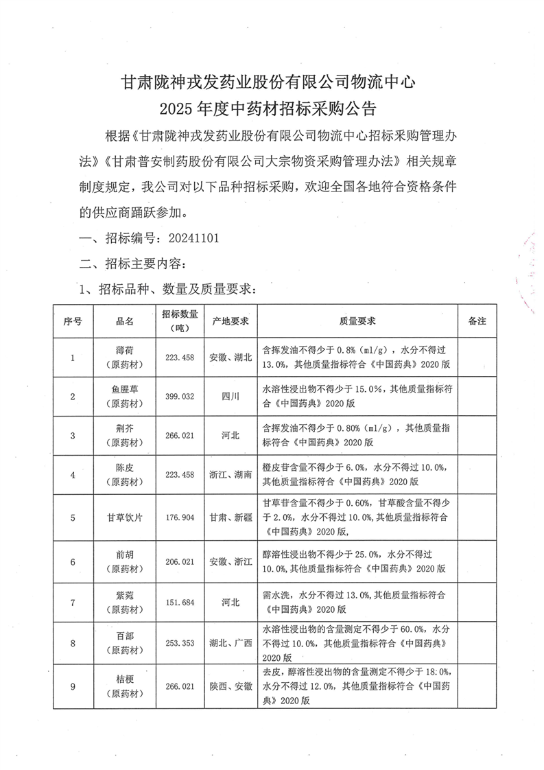 甘肃陇神戎发药业股份有限公司物流中心2025 年度中药材招标采购公告