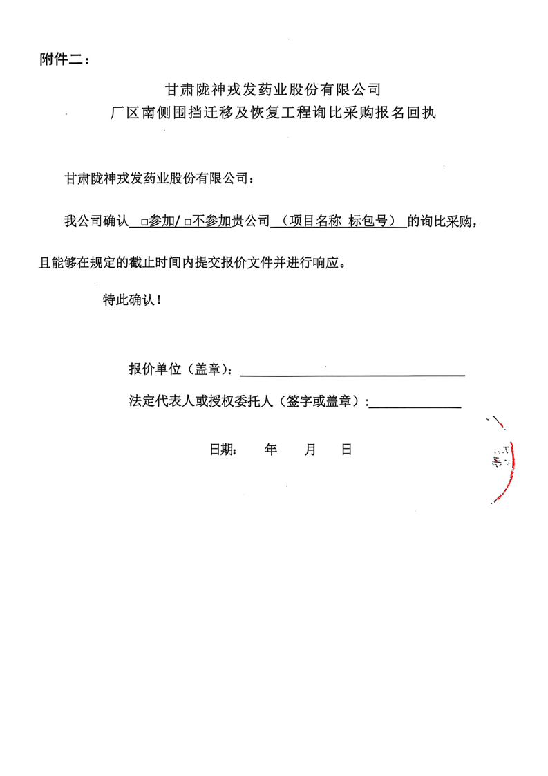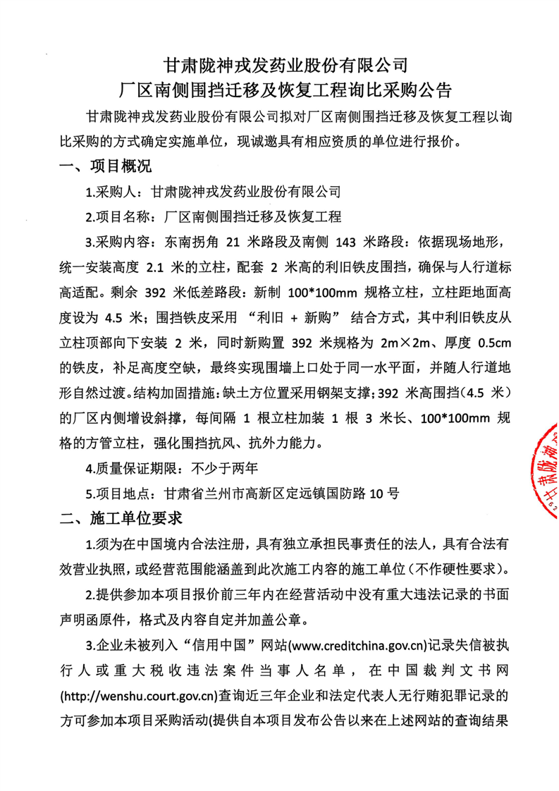 甘肃陇神戎发药业股份有限公司厂区南侧围挡迁移及恢复工程询比采购公告