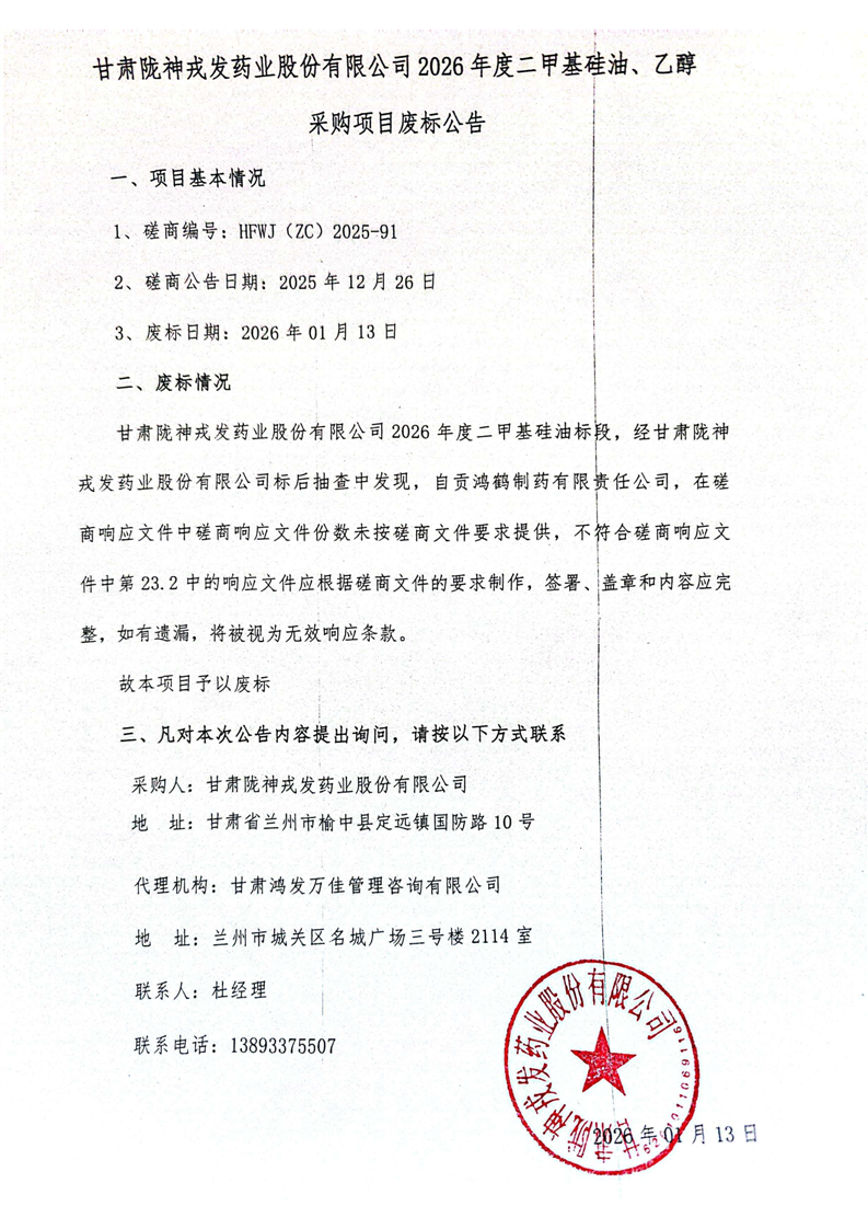 甘肃陇神戎发药业股份有限公司2026年度二甲基硅油、乙醇采购项目废标公告