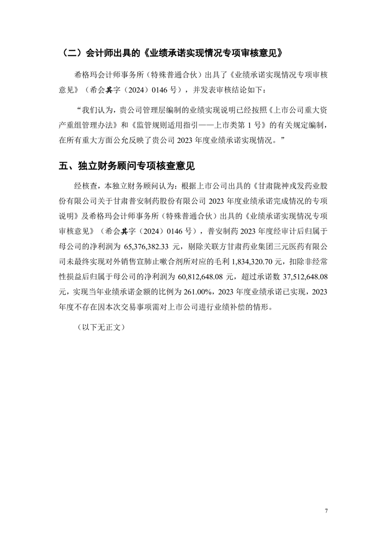华龙证券股份有限公司关于甘肃陇神戎发药业股份有限公司重大资产购买暨关联交易之2023年度业绩承诺实现情况的专项核查意见(更正后)