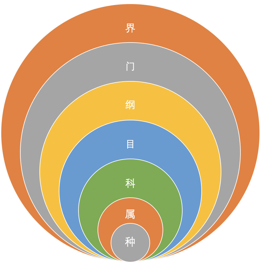 ä¸è¬å¨çç©å¦ä¸ï¼æç §é¶å ç³»ç»è¿è¡åç±»ï¼éå¸¸å æ¬ä¸ä¸ªä¸»è¦çº§å«ï¼çãé¨ã纲ãç®ãç§ãå±ãç§ãç§æ¯åºæ¬åå ãä»çå°ç§ï¼èå´éæ¥ç¼©å°ã