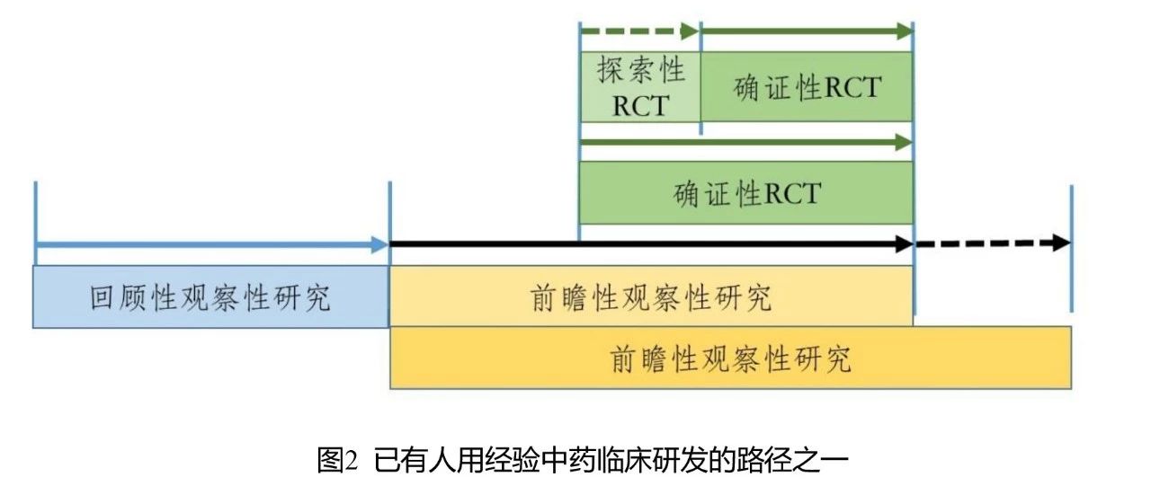 é对è§å¯æ§ç ç©¶ä¸RCTæPCTç ç©¶ç¸ç»åçç åçç¥ï¼å ¶å®ç°ä¹å¯ä»¥æå¤ç§è·¯å¾ï¼å¾2åå¾3æ¯å¯è½è·¯å¾ä¸ç两ç§ï¼ä½ä¸éäºæ¤ãå¾2æ¯è§å¯æ§ç ç©¶ä¸RCTç ç©¶ç¸ç»åçè·¯å¾ï¼ç¬¬ä¸é¶æ®µå å¼å±å顾æ§è§å¯æ§ç ç©¶ï¼æ¤é¶æ®µåºå°½å¯è½å°æ¶éæ¢å¾ä¸ä½¿ç¨è¯¥è¯åæå ³ççå®ä¸çæ°æ®ï¼å æ¬ææå¯è½çååéï¼å¶å®æ°æ®æ¸ çè§åï¼éæ©å¯è½çå¯¹ç §ï¼å¯¹æ°æ®è´¨éè¿è¡è¯ä¼°ï¼éç¨æ°å½çç»è®¡æ¹æ³è¿è¡å ¨é¢è¯¦ç»çåæã妿éè¿å顾æ§è§å¯æ§ç ç©¶å¾åºè¯¥è¯åå¨ä¸´åºåºç¨ä¸å¯¹æ£è å ·ææ½å¨è·çï¼å¯ä»¥è¿å ¥ä¸ä¸ç ç©¶é¶æ®µï¼å¦åç ç©¶ç»æ¢ã第äºé¶æ®µå¼å±åç»æ§è§å¯æ§ç ç©¶ãç±äºæäºç¬¬ä¸é¶æ®µçç ç©¶åºç¡ï¼è¯¥é¶æ®µå¯ä»¥å°åç»æ§è§å¯æ§ç ç©¶è®¾è®¡å¾æ´å å¨å¯ï¼å æ¬æ°æ®çééåå ¶ç³»ç»ãæ°æ®çè´¨éæ§å¶ãæ°æ®æ¸ ççè§åãæç¡®å®ä¹å¯¹ç §çãå¨åç»æ§è§å¯æ§ç ç©¶è¿å±å°æä¸æ¶æï¼å¦ææ°æ®åæç»æä¸å顾æ§è§å¯æ§ç ç©¶ç»æä¸è´ï¼ä¸ç»§ç»æ¾ç°åºè¯¥è¯åå¨ä¸´åºåºç¨ä¸å¯¹æ£è å ·æææ¾è·çï¼å¯éæ¶å¹³è¡å¼å±ç¬¬ä¸é¶æ®µçRCTç ç©¶ãRCTç ç©¶å¯ä»¥å è¿è¡æ¢ç´¢æ§RCTç ç©¶ï¼ä½å¦æåæçè§å¯æ§ç ç©¶è¯æ®è¾å åï¼ä¹å¯ä»¥ç´æ¥è¿è¡ç¡®è¯æ§RCTç ç©¶ã仿¶é´ä¸çï¼RCTç ç©¶ç卿å¯è¢«åç»æ§è§å¯æ§ç ç©¶æè¦çï¼åè å¯ä»¥å¨RCTç ç©¶å¼å§åç»æï¼ä¹å¯ä¸RCTç ç©¶åæ¶ç»æï¼çè³å¨RCTç ç©¶ç»æåç»§ç»å»¶å±ä¸æ®µæ¶é´ï¼ä»¥ç§¯ç´¯æ´å åççå®ä¸çè¯æ®ï¼æç¨äºå ¶ä»ç®çï¼å¦å¢å éåºçææ©å¤§éç¨äººç¾¤èå´çã